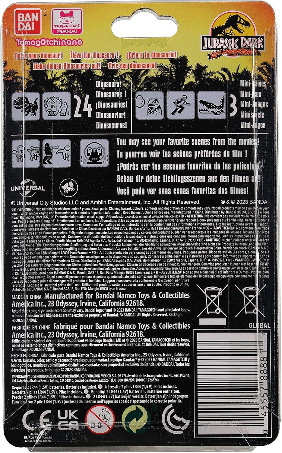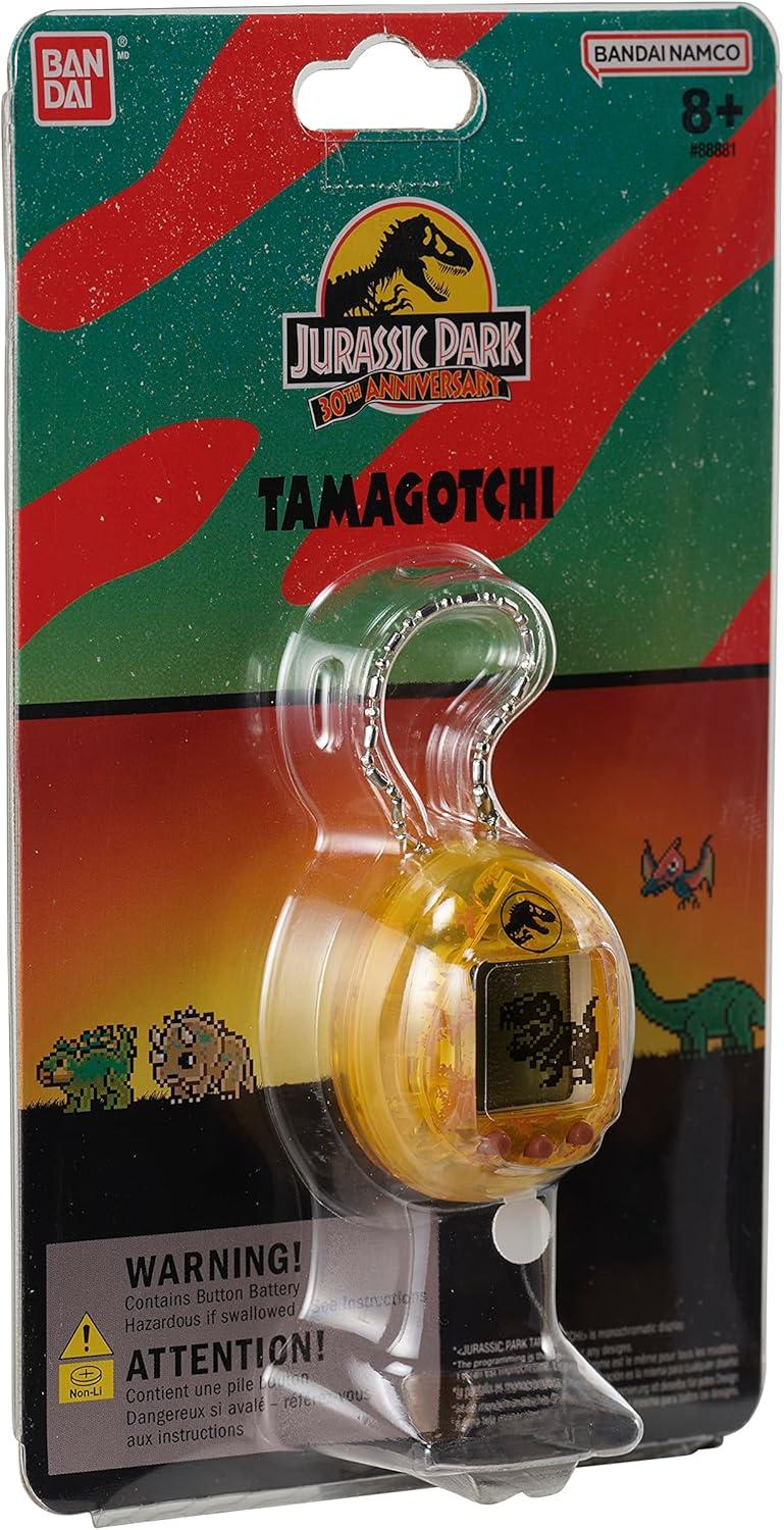 In this collaboration between Jurassic Park 30th Anniversary and Tamagotchi, you can raise dinosaurs! If your dinosaur is hungry, you can feed them leaves and nuts if they are herbivores, or meat and fish if they are carnivores. When they are in a bad mood, give them a snack or play the three mini-games. The three mini-games you can play are called “Which One?”, “Escape”, and “Catch Food!”. Depending on how you take care of your baby-Dino, they may evolve into over 20 different dinosaurs. In addition to nurturing characters, rare dinosaurs may appear! If you don’t take proper care of your dinosaur, they will leave you. Batteries (LR44x2) included. For Ages 8+.