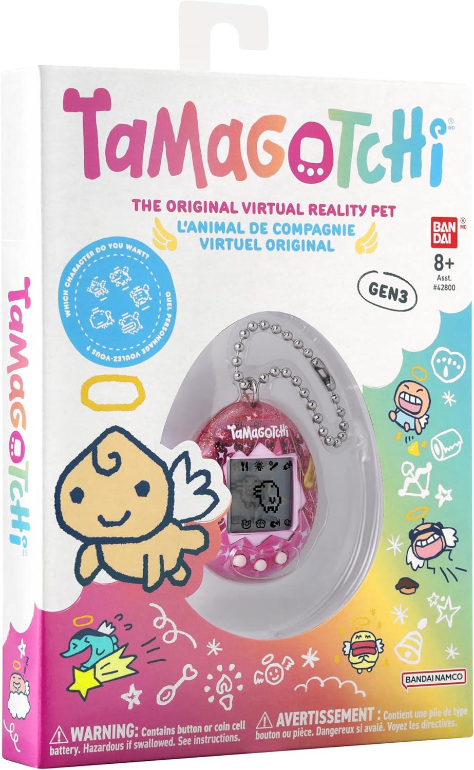 The Original digital pet you love with a Angel Cake shell design and three-dimensional wings! Comes with the Angel programming, the device will begin with the Obaketchi Angel (a ghost character) and depending on how you nurture your character will determine which of the 5 adult Tamagotchi Angel characters you will get. You feed it, clean up after it, and even praise it. Plus, you can play the Shooting Star mini game! Includes the CR2032 battery and attaches to your bag so it goes everywhere! Ages 8+.