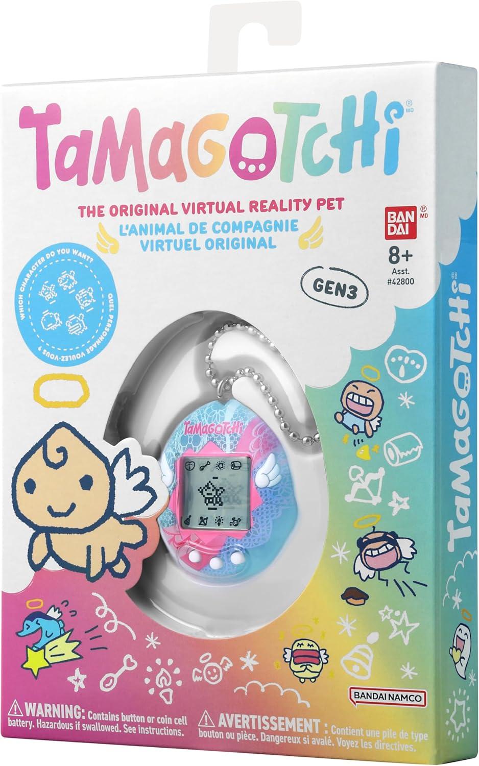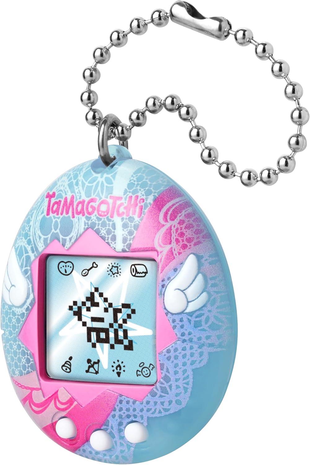 The Original digital pet you love with a Angel Cake shell design and three-dimensional wings! Comes with the Angel programming, the device will begin with the Obaketchi Angel (a ghost character) and depending on how you nurture your character will determine which of the 5 adult Tamagotchi Angel characters you will get. You feed it, clean up after it, and even praise it. Plus, you can play the Shooting Star mini game! Includes the CR2032 battery and attaches to your bag so it goes everywhere! Ages 8+.