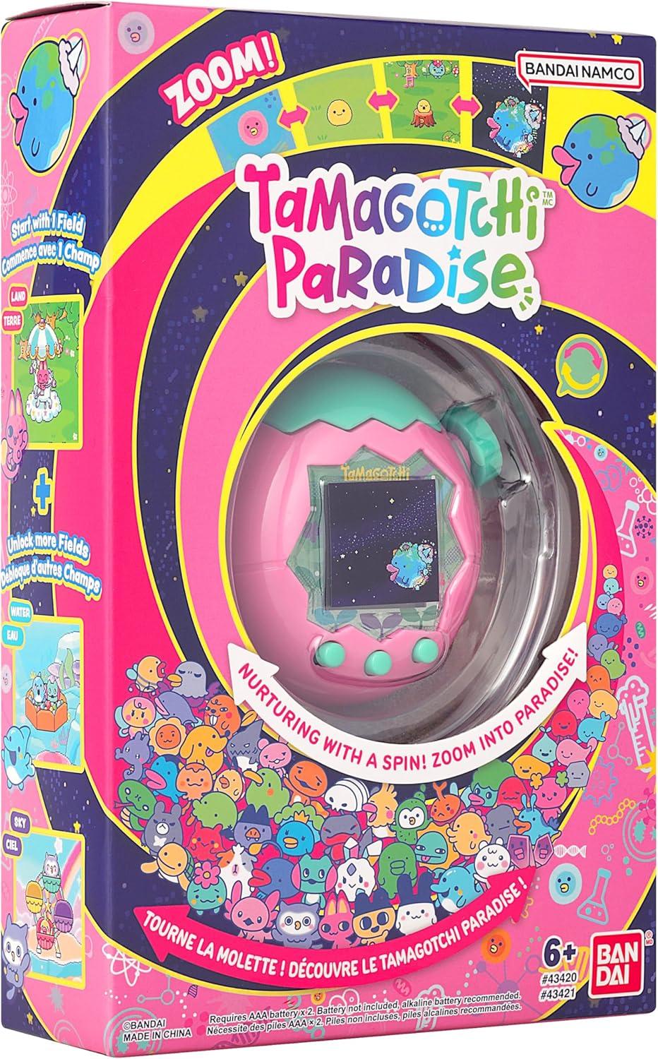 Nurture with a spin and zoom into paradise with Tamagotchi Paradise and start in the Pink Land! Turn the zoom dial to take care of your Tamagotchi character from cell to space. Zoom into the “New” Tamagotchi Planet for traditional nurturing play – clean the poop in the field, feed them delicious food, and make them feel better at the new “cell” level! Plus, there’s the new “Lab Mode” play with new mini-games, shop and all new fun nurturing activities! Connect with friend's devices and unlock 2 other fields (Water and Sky) for more play!