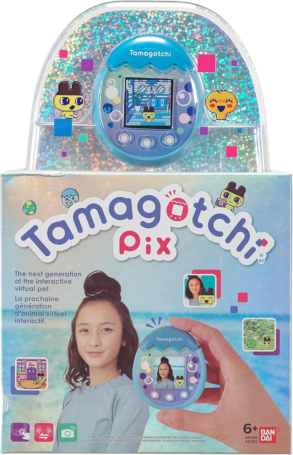 Tamagotchi Pix is the newest generation of your favorite interactive virtual pet with a sky design and purple shell. For the first time ever, the Tamagotchi device has a camera and touch buttons! While maintaining its core Tamagotchi attributes of nurturing, communication, portability, and gaming, your virtual pet is better than ever! Use the camera to help nurture your character by cooking its meals, customizing different items, exploring to find 100 Tamagotchi friends, and so much more. Plus, you can even take pictures WITH your Tamagotchi character! The new touch buttons allow you to interact with your character in ways like never before. You can also connect with your friend’s Tamagotchi Pix using a Tama code, and even plan character play dates for a later time. Ages 6+