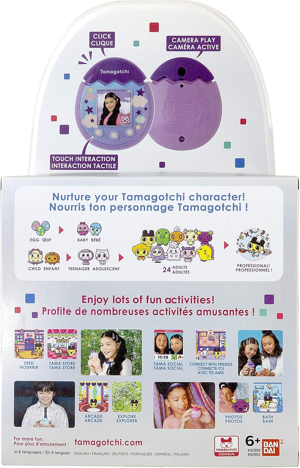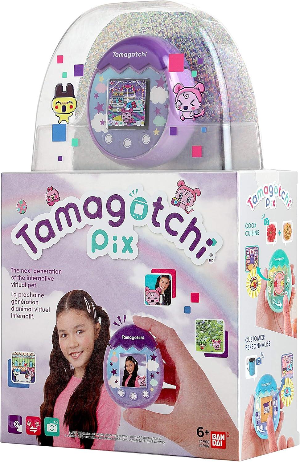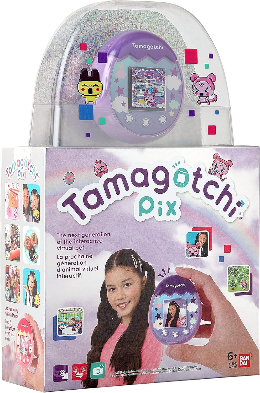 Tamagotchi Pix is the newest generation of your favorite interactive virtual pet with a sky design and purple shell. For the first time ever, the Tamagotchi device has a camera and touch buttons! While maintaining its core Tamagotchi attributes of nurturing, communication, portability, and gaming, your virtual pet is better than ever! Use the camera to help nurture your character by cooking its meals, customizing different items, exploring to find 100 Tamagotchi friends, and so much more. Plus, you can even take pictures WITH your Tamagotchi character! The new touch buttons allow you to interact with your character in ways like never before. You can also connect with your friend’s Tamagotchi Pix using a Tama code, and even plan character play dates for a later time. Ages 6+